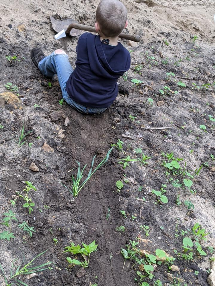 | This boy loves his shovels and dirt. Notice his butt scootin' trail. |